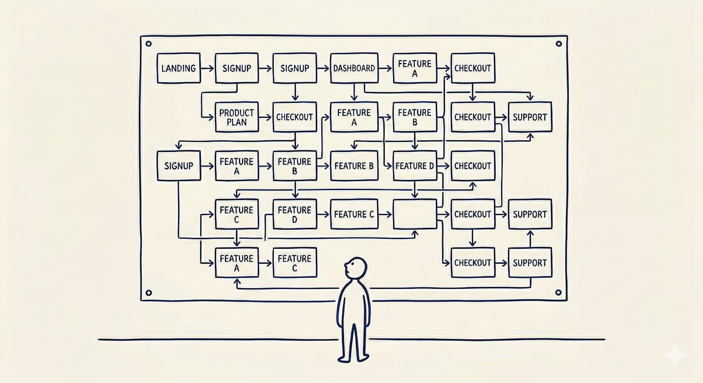 The thing about a journey map is that you can't really read it without holding the larger flow in your head. To make sense of it, you have to understand why one box comes before another — what a completed auth flow implies about the payment flow downstream, what it means when a cluster of boxes lights up together versus ones that stay dark. The artifact requires internalization to interpret. That's not a side effect. That's the whole point.